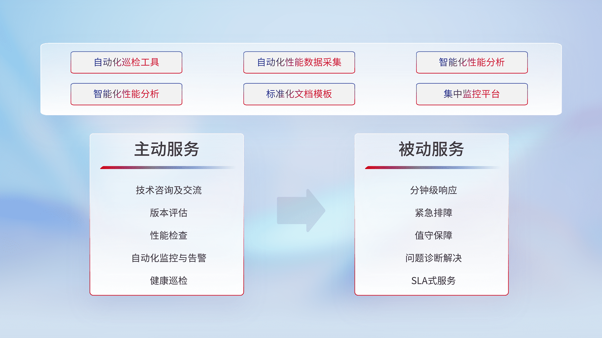 智能化工具和标准化文档,,,保障服务质量,,,提供主动服务(包含技术咨询、、、、版本评估、、性能检查、、、、自动化监控与告警、、、、健康巡检)和被动服务包含(分钟级响应、、、、紧急排障、、、、值守保障、、、问题诊断解决、、、、SLA服务)。。。。